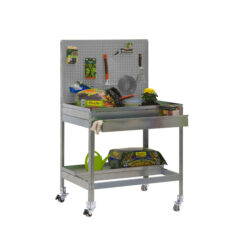 Banco de trabajo perfecto para el jardin y sus cuidados. No necesita anclaje a la pared. Es un banco de trabajo con una pared panel donde colocar herramientas y accesorios para una mejor organización del banco de trabajo.Tiene un grosor de MDF de 16 mm (0.6 ?). Al llevar ruedas la capacidad de carga es de 120kgs en total. Nuevo packaging en caja. Montaje sin tornillos. Se le añade un cajón que aguanta hasta 35 kgs, va con guías telescopicas para un manejo más cómodo del usuario. Color del producto GRIS/GALVANIZADO. Dimensiones 1440x1200x400. N‡ estantes 2