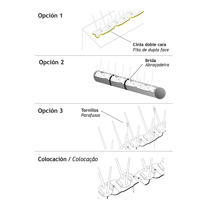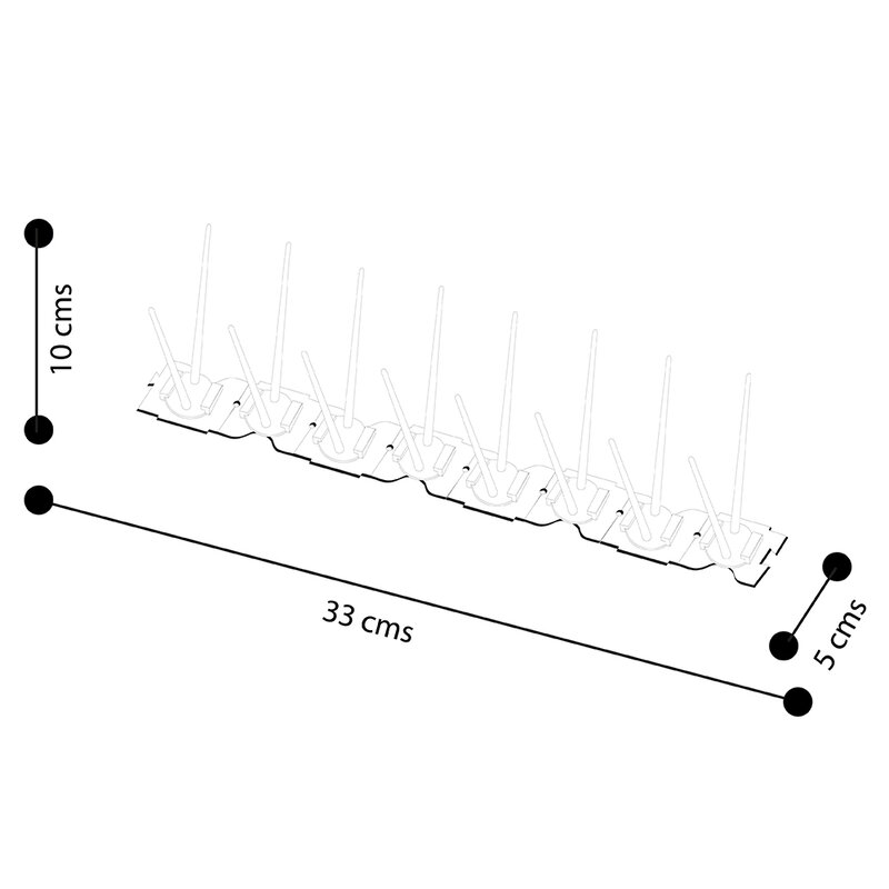 Con este práctico ahuyentador de palomas, se tiene lo necesario para evitar que estos animales se posen en sitios indeseados. El packaging de plástico contiene 3 tiras de 330mm de largo y son de fácil instalación.