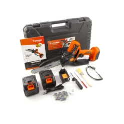 Kit completo de jardinería PRO  con tijera de poda AF28, motosierra AF180, pértiga telescópica y 2 baterías de 21V-4AH. Potente, ligero y perfecto para trabajos de jardinería y poda.