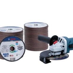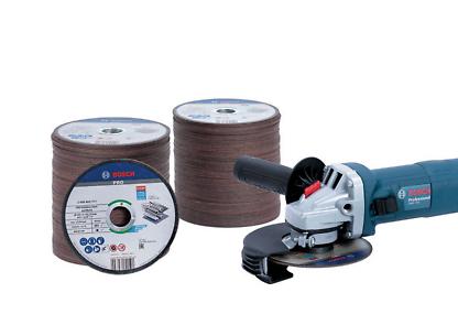 Incluye la miniamoladora Bosch GWS 750 y 200 discos abrasivos rectos de 125 mm de diámetro y 1 mm de grosor, con orificio de 22,23 mm para amoladoras con tuerca de bloqueo convencional.