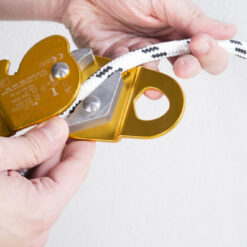 Fabricado en aluminio, este anticaídas es resistente y ligero, con un peso de solo 194 g. Su diseño compacto facilita el transporte y la instalación. Incluye sistema de bloqueo automático, aunque no incorpora absorbedor de energía ni conector, lo que permite configurarlo según las necesidades del usuario.