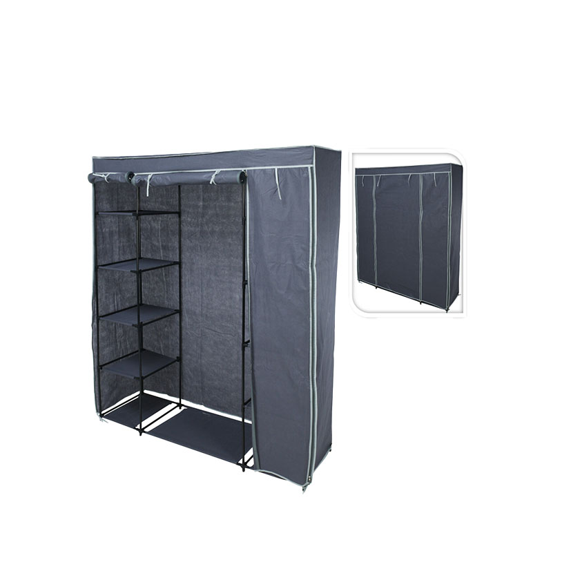 El armario auxiliar de lona ofrece una solución de gran capacidad para mantener todo en orden. Fabricado en lona resistente, es ligero, práctico y fácil de montar, ideal como armario adicional o para cambios de temporada. Cuenta con 4 estantes en cada lado (8 en total) que permiten ordenar prendas dobladas, cajas o zapatos de forma cómoda y accesible. En el centro dispone de un compartimento amplio con barra para colgar, ideal para camisas, chaquetas o vestidos.