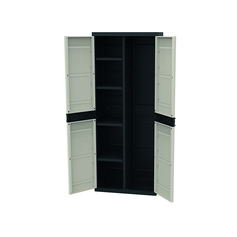 El armario escobero de resina Plastiken Titanium es perfecto para mantener tus utensilios de limpieza ordenados y accesibles. Fabricado en resina resistente a la intemperie, protege su contenido frente a lluvia, sol o humedad, lo que lo hace apto tanto para interiores como exteriores. Dispone de estantes interiores regulables para adaptar el almacenamiento a tus necesidades y cuenta con kit de montaje para un ensamblaje rápido y sencillo. Con unas dimensiones de 70 x 41 x 176 cm, combina capacidad y practicidad en un diseño compacto.