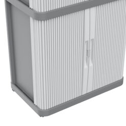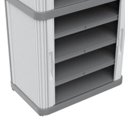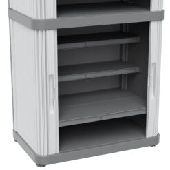 Armario multiusos de diseño robusto y resistente que puede ser ubicado tanto en interiores como en exteriores. Está fabricado en resina, un material plástico resistente a la intemperie, con protección contra la lluvia y certificado IP43. Está compuesto por 3 módulos, cada uno, dispone de puertas enrollables que permiten ahorrar espacio y 2 estantes que soportan una carga máxima de 10 Kg. Viene desmontado en una caja y tu mismo puedes realizar el montaje de forma sencilla. En nuestra web disponemos de diferentes modelos de armarios de esta misma serie.