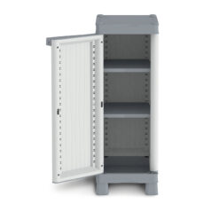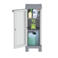 Armario de gran versitilidad que puede ser ubicado tanto en interiores como en exteriores. Está fabricado en polipropileno, un material plástico resistente a la intemperie. Dispone de 2 estantes que soportan un peso máximo de 15 kg y los puedes regular en altura. Viene desmontado en una caja y tu mismo puedes realizar el montaje de forma sencilla. En nuestra web disponemos de diferentes armarios de esta misma serie para que los puedas combinar según precises.