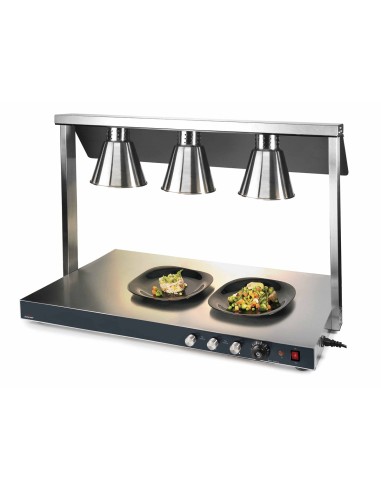 Placa calentadora de acero inoxidable con regulación de temperatura entre 40ºC – 90ºC. Lámparas halógenas para garantizar una temperatura homogénea con regulación. independiente para cada una de ellas. Pantalla protectora de plexiglás altamente resistente.
