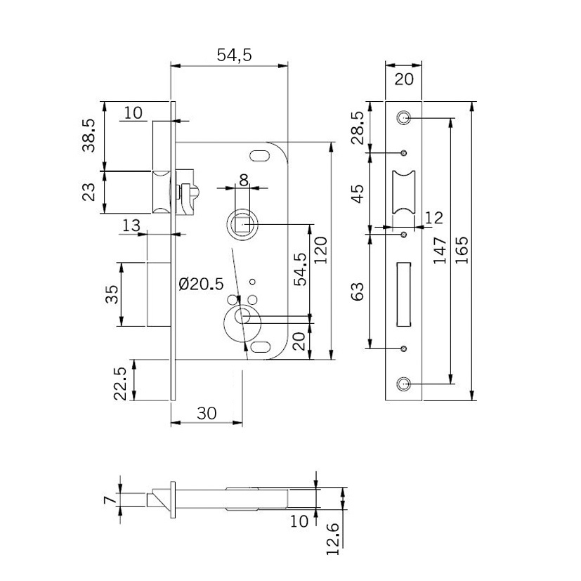 Cerradura para embutir en puerta de madera. Frente estrecho adecuado para puertas con solapa de 20 mm. Golpe y llave estriada. Doble cilindro redondo desmontable. El cilindro acciona la palanca, 1 vuelta, y el picaporte. Es reversible y con frente de hierro latonado. Puedes ver las medidas de la cerradura consultando el croquis que tenemos colgado en nuestra web.