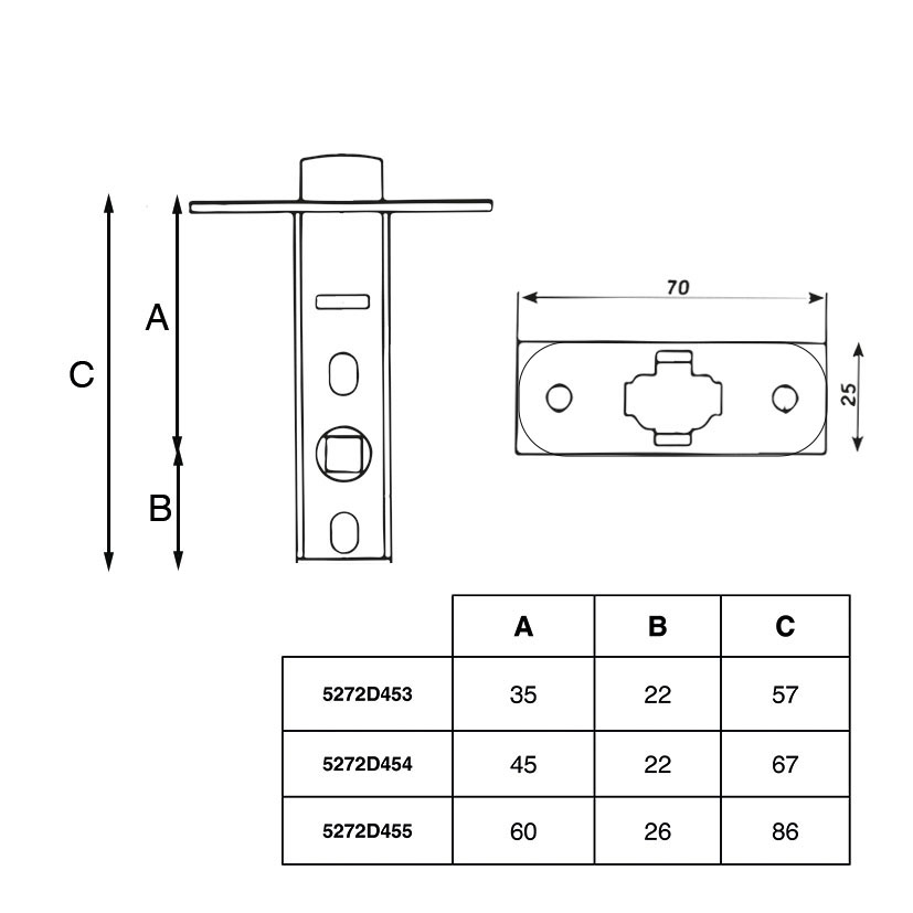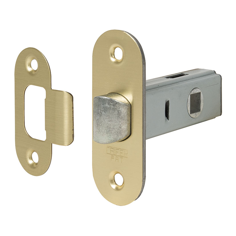 Cerradura para picaporte de golpe solo y cuadradillo de 8 mm. Está disponible en diferentes anchuras de entrada y tiene los acabados en latón. Se sirve en caja de 20 unidades.