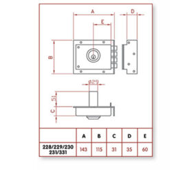 Cerradura de sobreponer tradicional horizontal con cilindro fijo de 51mm, picaporte y 4 bulones de acero inoxidable con dos vueltas. El cilindro tiene un diámetro de 29mm. Este modelo no es reversible y está disponible en mano izquierda y derecha. Incluye 3 llaves de alpaca nº2. Se presenta en una caja.