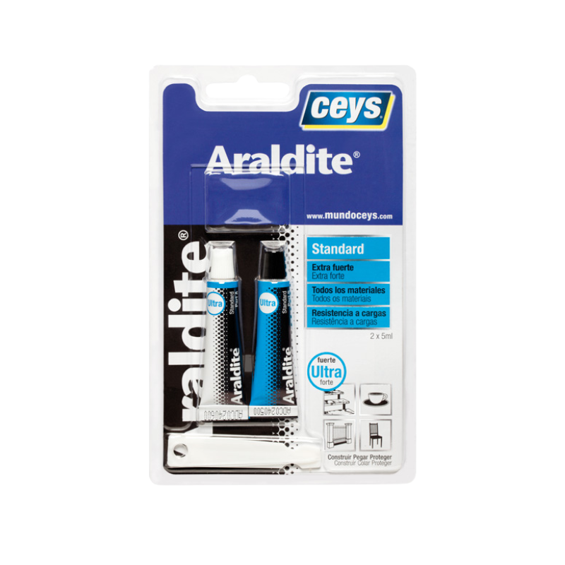 Ceys Araldite Standard es un adhesivo epoxi compuesto por resina y endurecedor que reaccionan al mezclarse para crear una unión extremadamente fuerte y duradera. Está especialmente recomendado para realizar uniones estructurales de gran resistencia en distintos materiales.