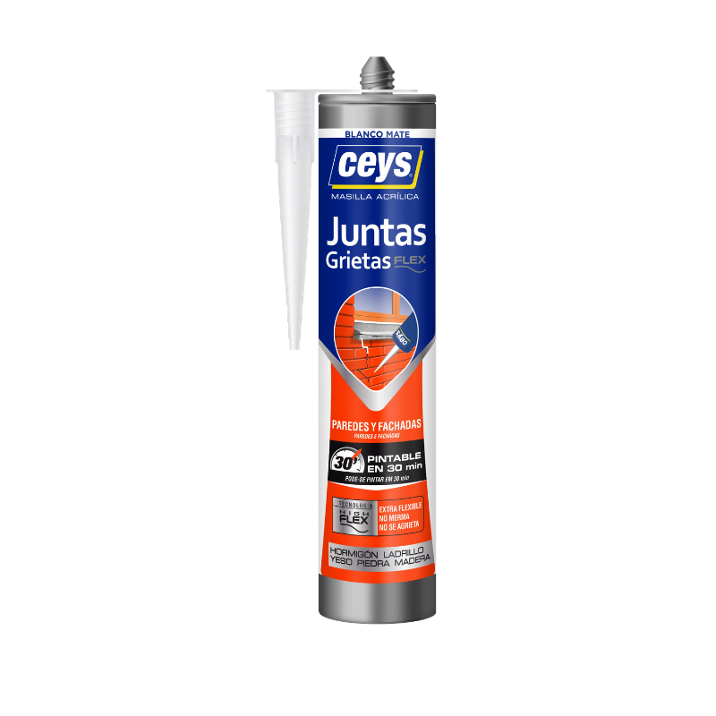 Ceys Juntas y Grietas Flexible es una masilla acrílica profesional diseñada para sellar y reparar juntas y fisuras de forma rápida, limpia y duradera. Su fórmula incorpora Tecnología HIGH FLEX, que proporciona una mayor elasticidad evitando que el sellado se agriete o merme con el paso del tiempo.