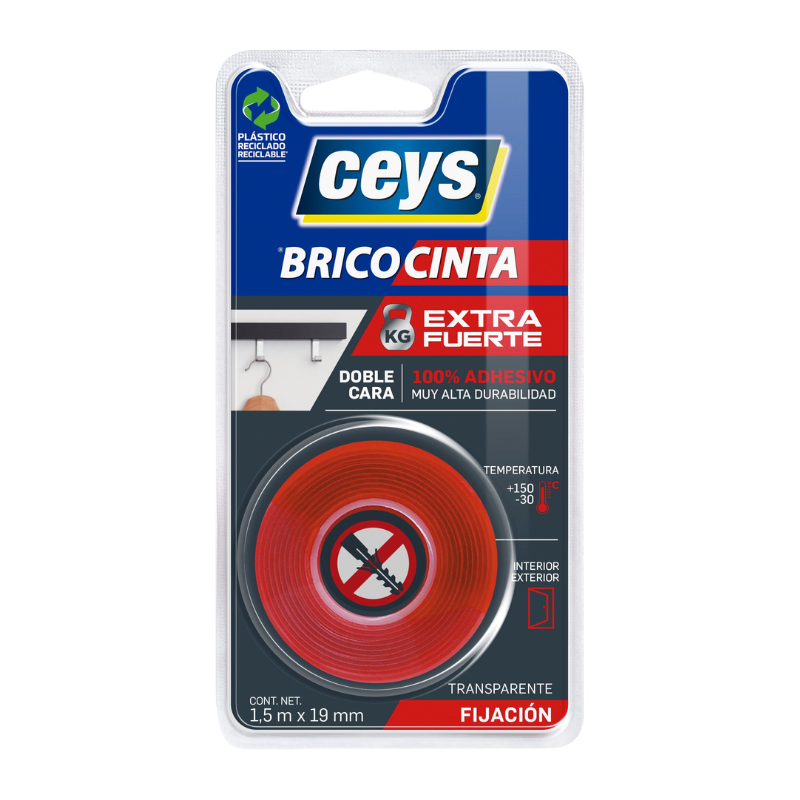 Ceys Bricocinta extra fuerte transparente para fijaciones rápidas y limpias en madera, metal, plástico, vidrio o azulejos.