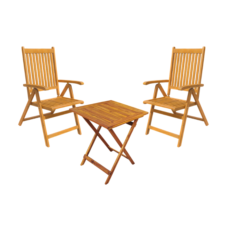 Este conjunto de la serie Mediterráneo está pensado para crear un espacio práctico y acogedor en terrazas, jardines o balcones. Incluye dos sillas plegables con respaldo regulable y una mesa compacta, todo fabricado en madera de acacia, un material resistente que se comporta muy bien en exteriores y aporta un acabado cálido y elegante.