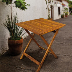La mesa, con formato cuadrado de 60 x 60 cm, funciona perfectamente como apoyo sin recargar el espacio. Es ligera, funcional y también plegable, por lo que puedes guardarla cómodamente cuando no la necesites o moverla según el uso.