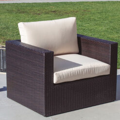 Sillón individual del modelo Barbados fabricado por una estructura metálica y ratán sintético plano, ideal y de gran resistencia a la intemperie. Es elegante y de gran comodidad para colocarlo en tu rincón favorito y poder hacer un lugar especial para disfrutar del tiempo libre. Los cojines están fabricados en poliéster, material idóneo para exteriores. En nuestra web disponemos del conjunto de esta misma serie con la referencia 8704N112. Viene presentado en caja. Atención, este conjunto no viene montado. Nota: Los colores y tonalidades de los productos presentados pueden verse ligeramente alterados por la luz, el ángulo, el color de fondo, etc. Ubicación del producto: Se recomienda colocar el mueble bajo techado, resguardado de la lluvia y el sol directo.