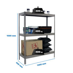 Cada estante tiene una capacidad de carga de 400 kg, alcanzando una capacidad total de 1200 kg.