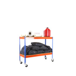 Estantería metálica de media carga con ruedas (color azul/naranja/madera) con 2 estantes.