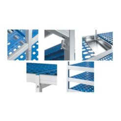 Las estanterías modulares de Lacor están diseñadas para poder emplear cubetas Gastronorm 2/1, 1/1 y 2/3, con 2 anchuras de fondo disponibles: 560 mm y 385 mm. La distribución de sus estantes permite el máximo aprovechamiento de la altura disponible, con un máximo de 11 estantes en altura 1750 mm y de 12 estantes en altura de 2000 mm, con un peso máximo aproximado por estantería de 120 Kg. La altura útil mínima de estas estanterías modulares es de 100mm, especialmente recomendada para almacenar medicamentos, artículos de ferretería, alimentos en conserva… Las distintas alturas de los estantes y su fácil montaje/desmontaje permiten que las distancias entre estantes puedan variarse a razón de 150 mm adicionales a los 100 mm iniciales (100 mm / 250 mm / 400 mm / 550 mm)