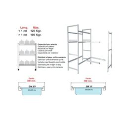 Las estanterías modulares de Lacor están diseñadas para poder emplear cubetas Gastronorm 2/1, 1/1 y 2/3, con 2 anchuras de fondo disponibles: 560 mm y 385 mm. La distribución de sus estantes permite el máximo aprovechamiento de la altura disponible, con un máximo de 11 estantes en altura 1750 mm y de 12 estantes en altura de 2000 mm, con un peso máximo aproximado por estantería de 120 Kg. La altura útil mínima de estas estanterías modulares es de 100mm, especialmente recomendada para almacenar medicamentos, artículos de ferretería, alimentos en conserva… Las distintas alturas de los estantes y su fácil montaje/desmontaje permiten que las distancias entre estantes puedan variarse a razón de 150 mm adicionales a los 100 mm iniciales (100 mm / 250 mm / 400 mm / 550 mm)