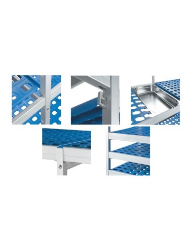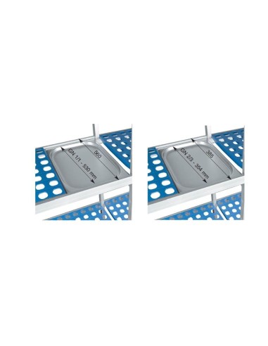 Las estanterías modulares de Lacor están diseñadas para poder emplear cubetas Gastronorm 2/1, 1/1 y 2/3, con 2 anchuras de fondo disponibles: 560 mm y 385 mm. La distribución de sus estantes permite el máximo aprovechamiento de la altura disponible, con un máximo de 11 estantes en altura 1750 mm y de 12 estantes en altura de 2000 mm, con un peso máximo aproximado por estantería de 120 Kg. La altura útil mínima de estas estanterías modulares es de 100mm, especialmente recomendada para almacenar medicamentos, artículos de ferretería, alimentos en conserva… Las distintas alturas de los estantes y su fácil montaje/desmontaje permiten que las distancias entre estantes puedan variarse a razón de 150 mm adicionales a los 100 mm iniciales (100 mm / 250 mm / 400 mm / 550 mm)