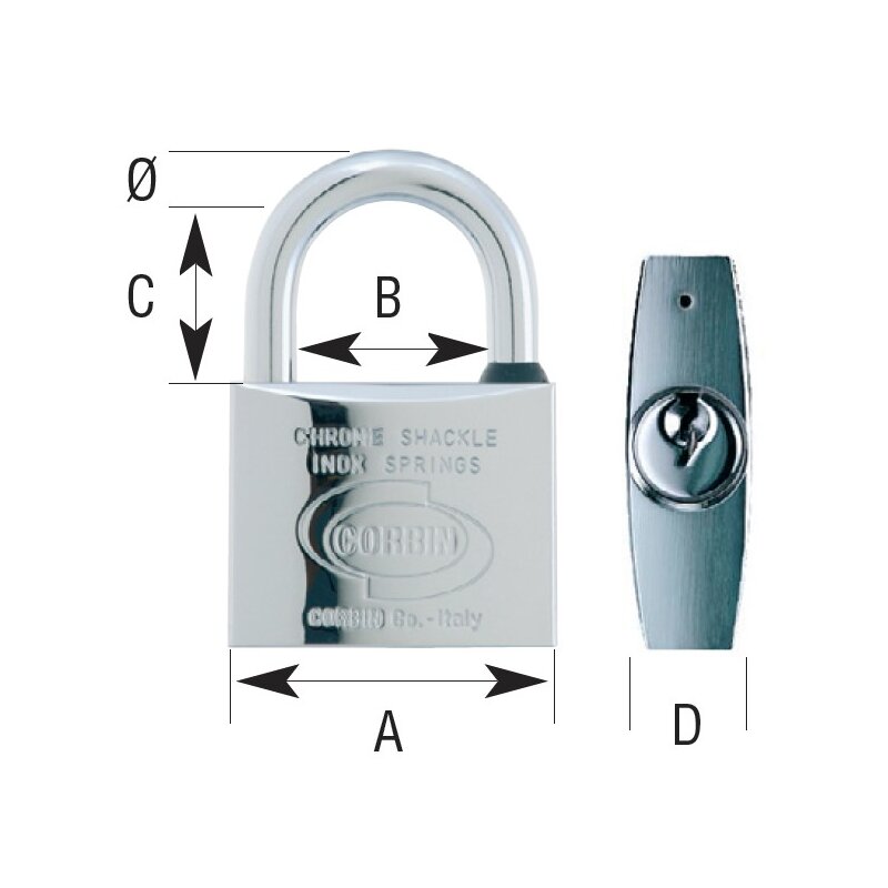 · Cuerpo y arco de latón cromoplateado. · Resistente a la corrosión. · Resortes de acero inoxidable. · Incluye 2 llaves. · Presentación en blíster.