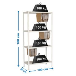 Estanteria metalica sin tornillos con bandejas metalicas. Montaje facil y rapido, en apenas 9 minutos la puedes tener montada. Es rigida, no se tambalea. No necesita anclaje a la pared. Tiene 4 estantes. Soporta 100 kg por bandeja metalica. Los complementos estan mas orientados a una oficina en el hogar. Lleva colgadores especiales para poder colocar carpetas colgantes. Producto fabricado en España. Medidas en uso del producto: 1585x1100x370 mm