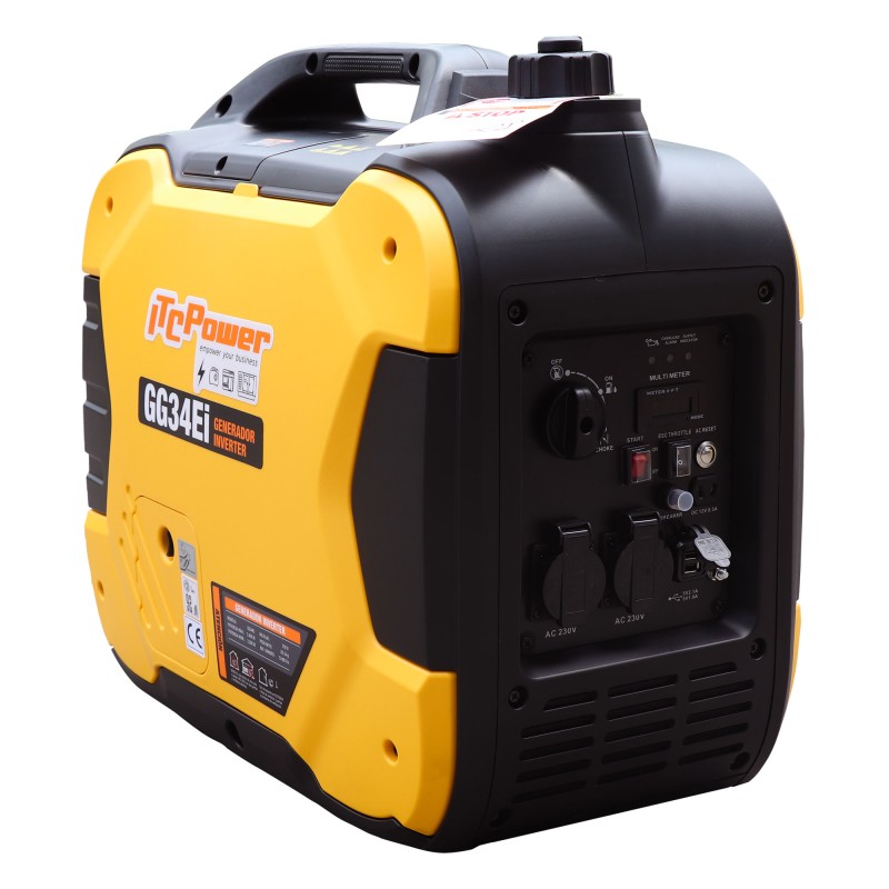 El ITC Power GG34Ei es un generador eléctrico inverter a gasolina diseñado para suministrar energía fiable en entornos móviles. Su formato tipo maletín facilita el transporte y almacenamiento, siendo ideal para caravanas, actividades al aire libre, pesca o pequeños puestos ambulantes.