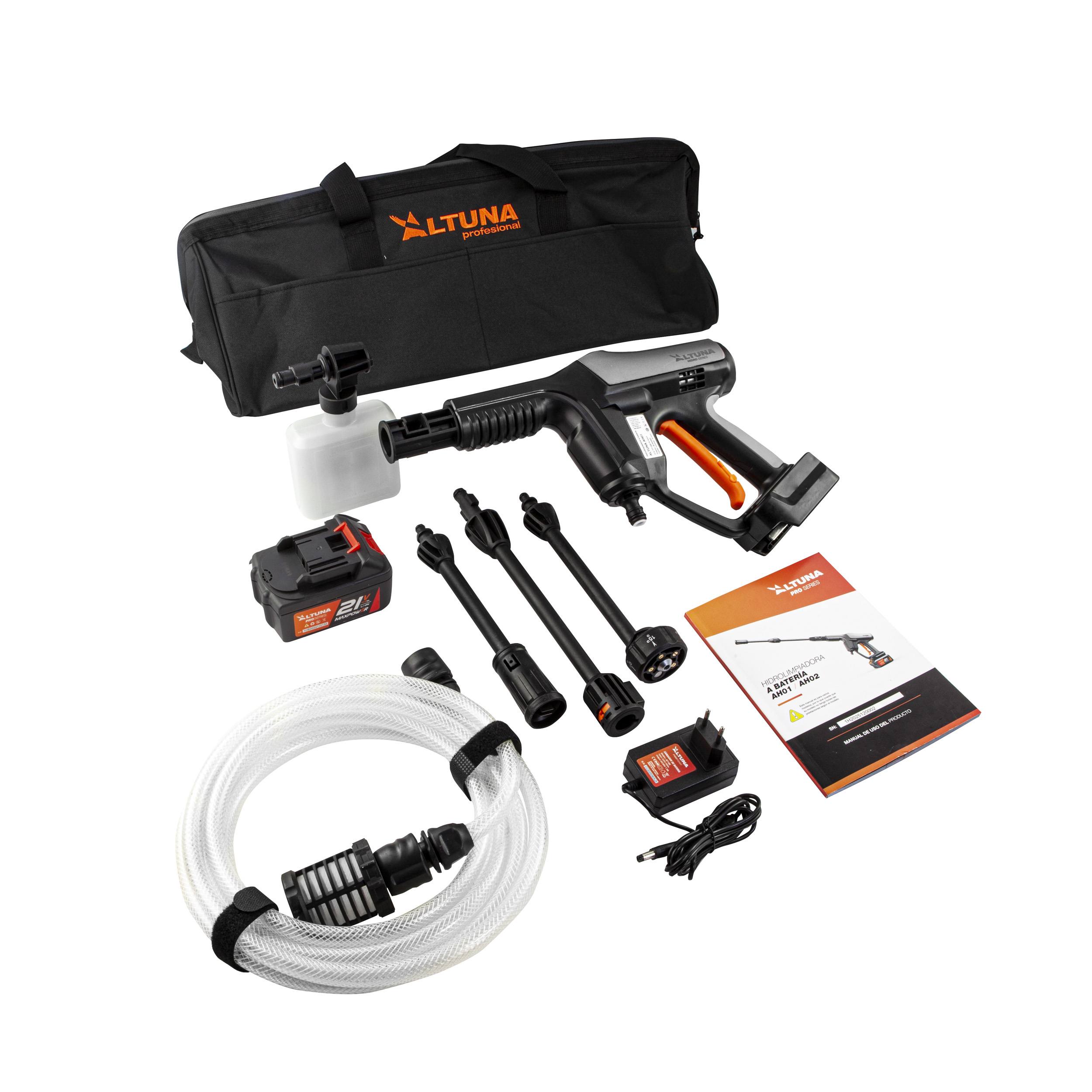 Hidrolavadora a batería Altuna AH01 con 40 bar de presión, 200 W de potencia y batería de 21 V. Limpieza portátil sin cables.