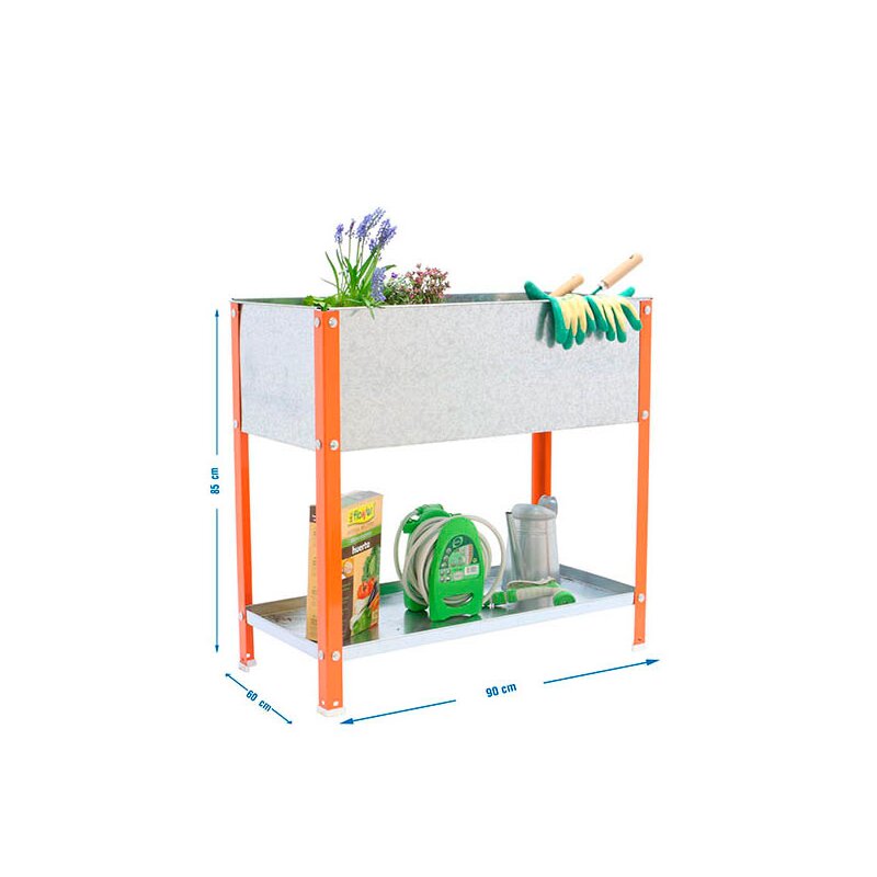 Huerto metalico rigido -Tiene una capacidad de 140 litros. Dispone en la parte inferior de una bandeja metalica para almacenar herramientas u objetos de jardin. Ideal para personas que desean disfrutar de un huerto en su casa y no disponen de todo el espacio que le gustarÃa. Montaje con tornillos. Huerto en casa para toda la familia. Montaje aprox. 9 mint .Color del producto NARANJA/GALVA. Dimensiones 850x900x600 . Nº estantes 2