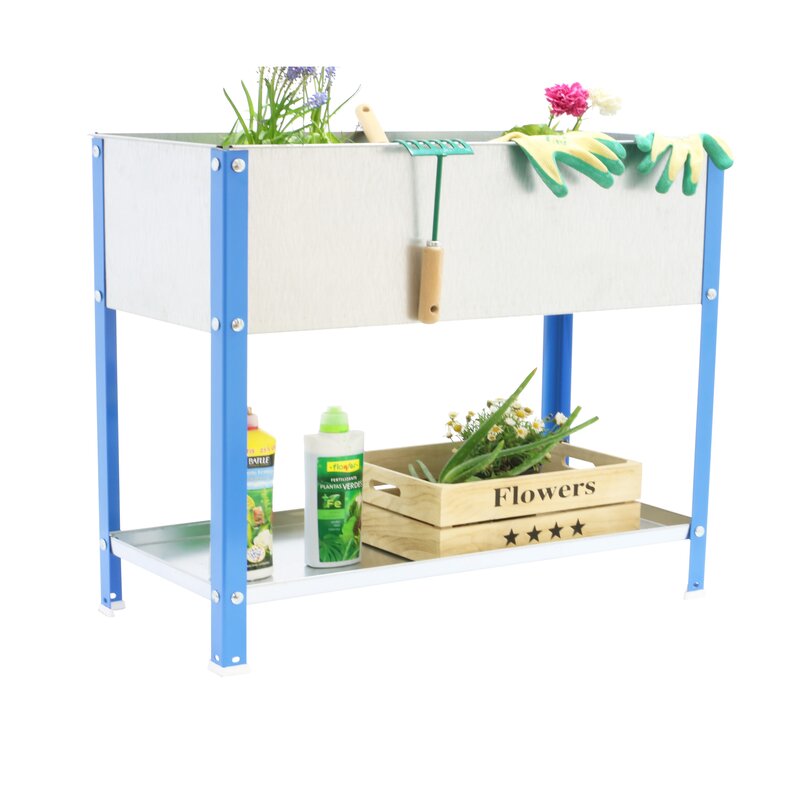 Huerto metalico rigido -Tiene una capacidad de 200 litros. Dispone en la parte inferior de una bandeja metalica para almacenar herramientas u objetos de jardin. Ideal para personas que desean disfrutar de un huerto en su casa y no disponen de todo el espacio que le gustaría. Montaje con tornillos. Huerto en casa para toda la familia. Montaje aprox. 9 mint .Color del producto AZUL/GALVANIZADO. Dimensiones 850x1200x600. Nº estantes 2
