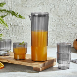 El Juego Jarra + Vasos Moritz Neve es la opción perfecta para quienes buscan servir y disfrutar de bebidas de manera elegante y práctica. Fabricado en poliestireno de color gris ahumado, este juego simula el aspecto del vidrio, pero con la ventaja de ser liviano y resistente. Con una jarra de 1,1 litros y 4 vasos de 300 ml, es ideal para servir agua, zumos, refrescos o cócteles, aportando un toque sofisticado a cualquier evento o comida.