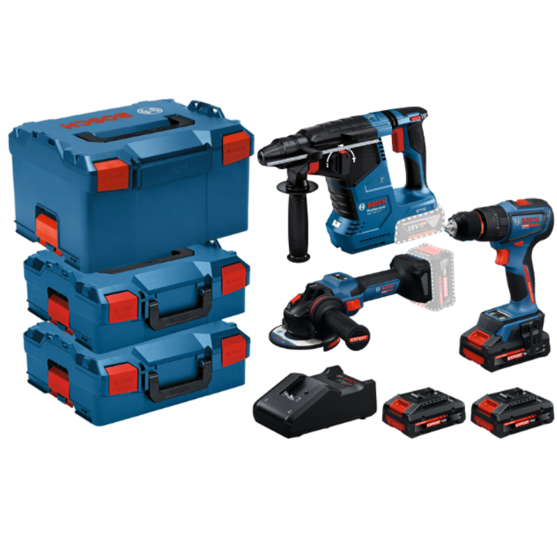 Kit de alta gama Bosch Expert de Taladro atornillador/percutor y amoladora Bosch está formado por las tres herramientas básicas para cualquier trabajo.