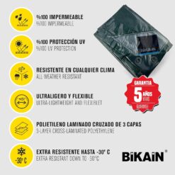 La lona ofrece 100 % impermeabilidad y protección UV, ayudando a proteger superficies y objetos de la humedad y de la exposición prolongada al sol. Además, soporta temperaturas de hasta -30 °C, manteniendo su flexibilidad en climas fríos.