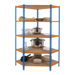 Estantería metálica esquinera sin tornillos con bandejas de aglomerado (color azul/naranja/madera).