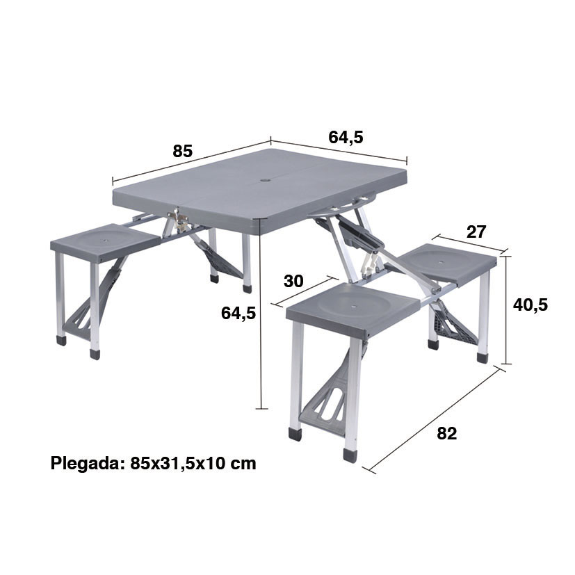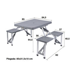 Esta útil mesa de camping, cuando está plegada es como una maleta de dimensiones lo suficientemente cómoda como para ser transportada de un sitio a otro. Cuando se abre y desplega, se convierte en una auténtica mesa con 4 bancos individuales y con un orificio en el centro de la misma para poder insertar una sombrilla. Tiene una estructura plástico/metal que la hace ligera pero resistente al mismo tiempo. Su peso total es de 6,8 kilos. Tiene unas dimensiones cuando está plegada de 85x10xh.31,5 cm Se presenta en una caja.
