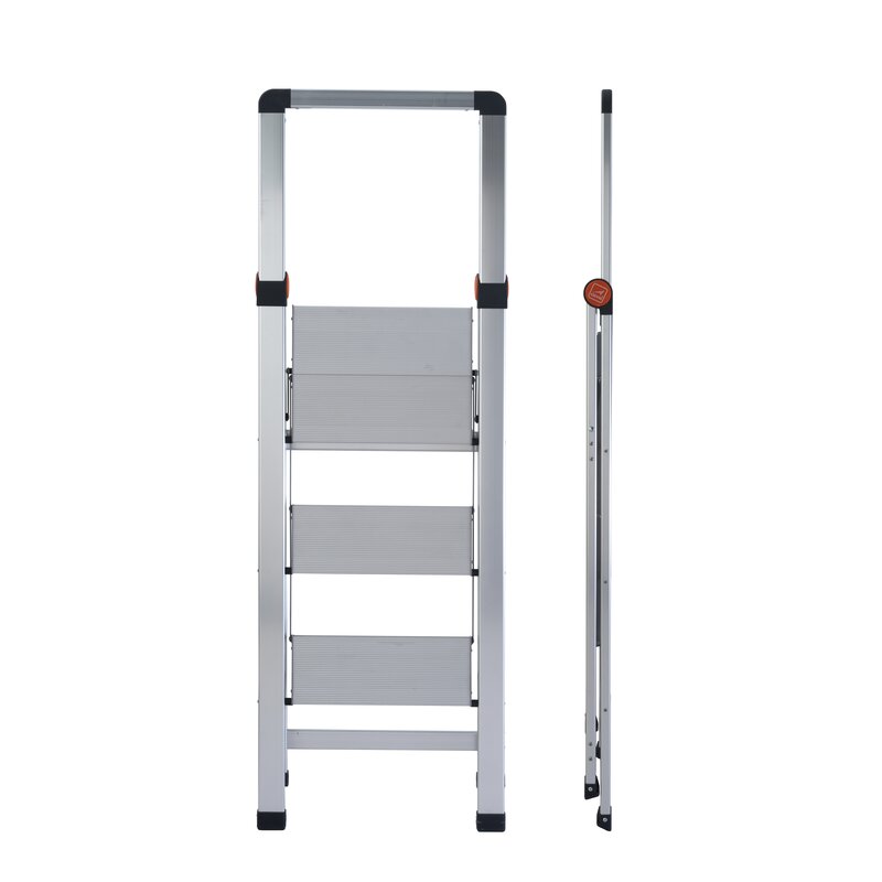 · Barandilla alta de seguridad. · Conexión metálica única de todos los escalones para una fácil apertura. · Anchos peldaños de 13 cm de largo. · Gran plataforma superior de 33 cm de ancho. · Requiere poco espacio de almacenamiento, plegada ocupa sólo 5 cm de ancho. · Patas con estrías antideslizantes. · Material: aluminio. · Resiste hasta 150 kg de carga.