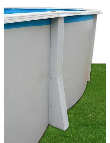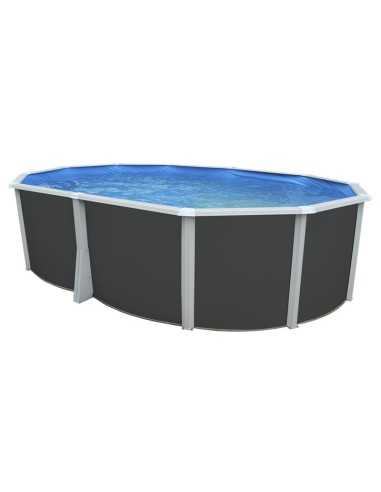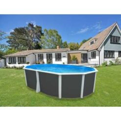 Piscina ovalada de 132 cm de altura sin contrafuertes. Estructura de acero con perfiles metálicos y skimmer completo.