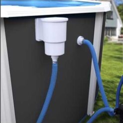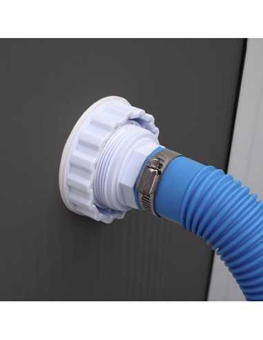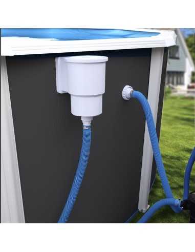 La piscina incluye un skimmer completo, compuesto por el cuerpo del skimmer, marco, junta de goma, tornillos, cestillo, compuerta, 2 racores, adaptador para la barredera, abrazaderas y la boquilla de impulsión.
