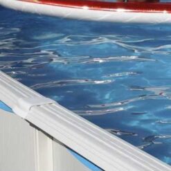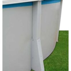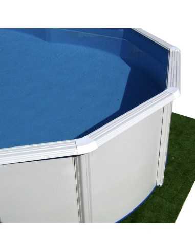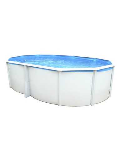 Piscina ovalada de 132 cm de altura sin contrafuertes. Estructura de acero con perfiles metálicos y skimmer completo.