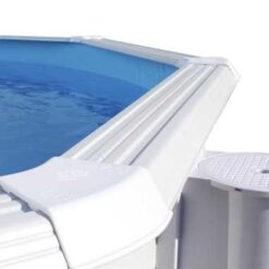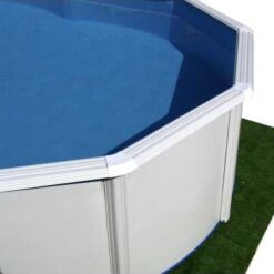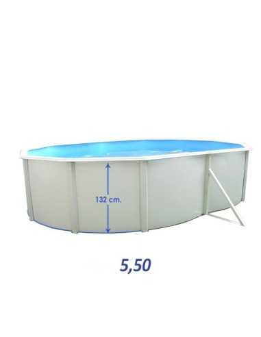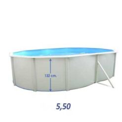Piscina ovalada de 132 cm de altura con chapa lacada en blanco. Estructura de acero con perfiles metálicos y skimmer completo. Incluye tapiz.