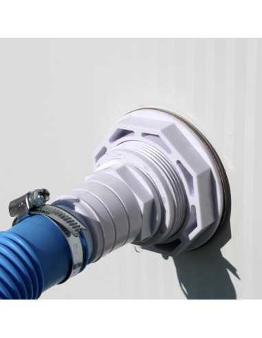 La piscina incluye un skimmer completo, compuesto por el cuerpo del skimmer, marco, junta de goma, tornillos, cestillo, compuerta, 2 racores, adaptador para la barredera, abrazaderas y la boquilla de impulsión.