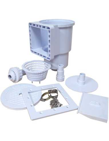 La piscina incluye un skimmer completo, compuesto por el cuerpo del skimmer, marco, junta de goma, tornillos, cestillo, compuerta, 2 racores, adaptador para la barredera, abrazaderas y la boquilla de impulsión.