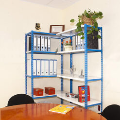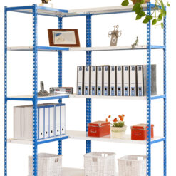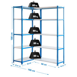Estantería metálica sin tornillos en forma de L, de color AZUL/BLANCO.Tiene 10 estantes. Las dimensiones de esta estantería son: 1800x1000x400 mm. Y tiene una capacidad de carga de 80 kgs,certificamos a punto de flexión,no de rotura.No se tambalea y no tiene aristas de corte. Es fabricado en España y se monta rápido siguiendo las instrucciones.