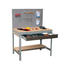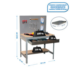 Banco de trabajo metálico de color GRIS/MADERA con capacidad de carga de 600 kg. Las medidas (alto x ancho x fondo) son 1445x1210x610 mm. Incluye cajón metálico con capacidad de 35 kg. Producto español, calidad europea, podrás encontrar las intrucciones de montaje en su interior o en este enlace: https://www.youtube.com/watch?v=GZQQnzXVsW4. Medidas en uso del producto: 1445x1210x610 mm