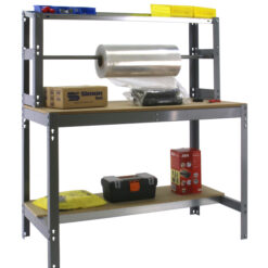Banco de trabajo sin tornillos con bandejas de madera. Incluye repisa superior (montaje con tornillos) y larguero cuelga rollos. Es de color GRIS/MADERA.Tiene 3 estantes. Las dimensiones de esta estantería son: 1445x1210x760 mm. Y tiene una capacidad de carga de 600 kgs el estante principal y 250 kgs el estante inferior. La repisa superior aguanta hasta 25 kgs. Es fabricado en España y se monta rápido siguiendo las instrucciones.