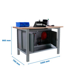 Banco de trabajo con tornillos y encimera de haya laminada, y cuenta con un estante inferior aportándole mucha resistencia al banco de trabajo. Con un armario metálico con una capacidad de carga de 50 kgs para guardar herramientas y accesorios. La encimera de haya laminada de 32 mm de espesor que aguanta mejor el impacto y los golpes. Es de color GRIS. Las dimensiones de este banco de trabajo son: 865x1200x750 mm. La encimera principal tiene una capacidad de carga en estático de 1000 kgs de forma uniformemente repartida por la superficie. Está fabricado en España y se monta fácil siguiendo las instrucciones.