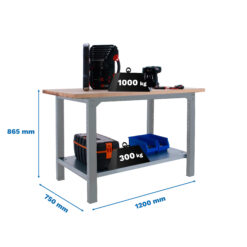 Banco de trabajo con tornillos y encimera de haya laminada, y cuenta con un estante inferior que tiene una capacidad de carga de 300 kgs aportándole mucha resistencia al banco de trabajo. La encimera de haya laminada de 32 mm de espesor que aguanta mejor el impacto y los golpes. Es de color GRIS. Las dimensiones de este banco de trabajo son: 865x1200x750 mm. La encimera principal tiene una capacidad de carga en estático de 1000 kgs de forma uniformemente repartida por la superficie. Está fabricado en España y se monta fácil siguiendo las instrucciones.