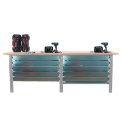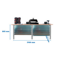Banco de trabajo con tornillos y encimera de haya laminada, y cuentan con estantes inferiores que tienen una capacidad de carga de 300 kgs aportándole mucha resistencia al banco de trabajo. Cuenta con 10 cajones metálicos con guías telescópicas para una mayor facilidad de uso, pudiendo poner como máximo 5 cajones en una misma estructura. La encimera de haya laminada de 32 mm de espesor que aguanta mejor el impacto y los golpes. Es de color GRIS. Las dimensiones de este banco de trabajo son: 8105x2100x750 mm. La encimera principal tiene una capacidad de carga en estático de 1000 kgs de forma uniformemente repartida por la superficie. Está fabricado en España y se monta fácil siguiendo las instrucciones.