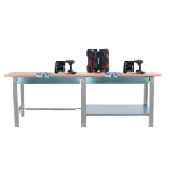 Banco de trabajo con tornillos y encimera de haya laminada, y cuentan con estantes inferiores que tienen una capacidad de carga de 300 kgs aportándole mucha resistencia al banco de trabajo. Cuenta con 2 cajones metálicos con guías telescópicas para una mayor facilidad de uso. La encimera de haya laminada de 32 mm de espesor que aguanta mejor el impacto y los golpes. Es de color GRIS. Las dimensiones de este banco de trabajo son: 865x2100x750 mm. La encimera principal tiene una capacidad de carga en estático de 1000 kgs de forma uniformemente repartida por la superficie. Está fabricado en España y se monta fácil siguiendo las instrucciones.