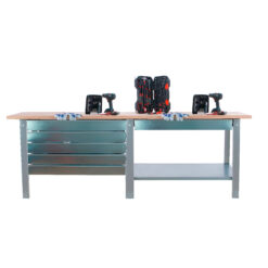 Banco de trabajo con tornillos y encimera de haya laminada, y cuentan con estantes inferiores que tienen una capacidad de carga de 300 kgs aportándole mucha resistencia al banco de trabajo. Cuenta con 6 cajones metálicos con guías telescópicas para una mayor facilidad de uso, pudiendo poner como máximo 5 cajones en una misma estructura. La encimera de haya laminada de 32 mm de espesor que aguanta mejor el impacto y los golpes. Es de color GRIS. Las dimensiones de este banco de trabajo son: 865x2100x750 mm. La encimera principal tiene una capacidad de carga en estático de 1000 kgs de forma uniformemente repartida por la superficie. Está fabricado en España y se monta fácil siguiendo las instrucciones.